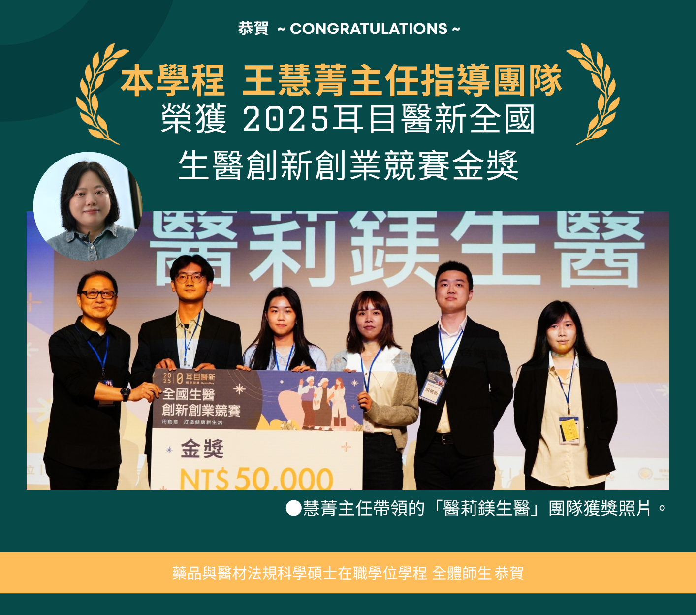恭賀~本學程王慧菁主任帶領實驗室研發團隊 獲得 北醫耳目醫新創新創業競賽金獎